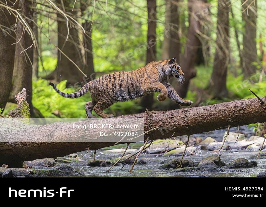One young female Siberian Tiger, Panthera tigris altaica, crossing a creek deep in a forest over a natural bridge, a fallen tree