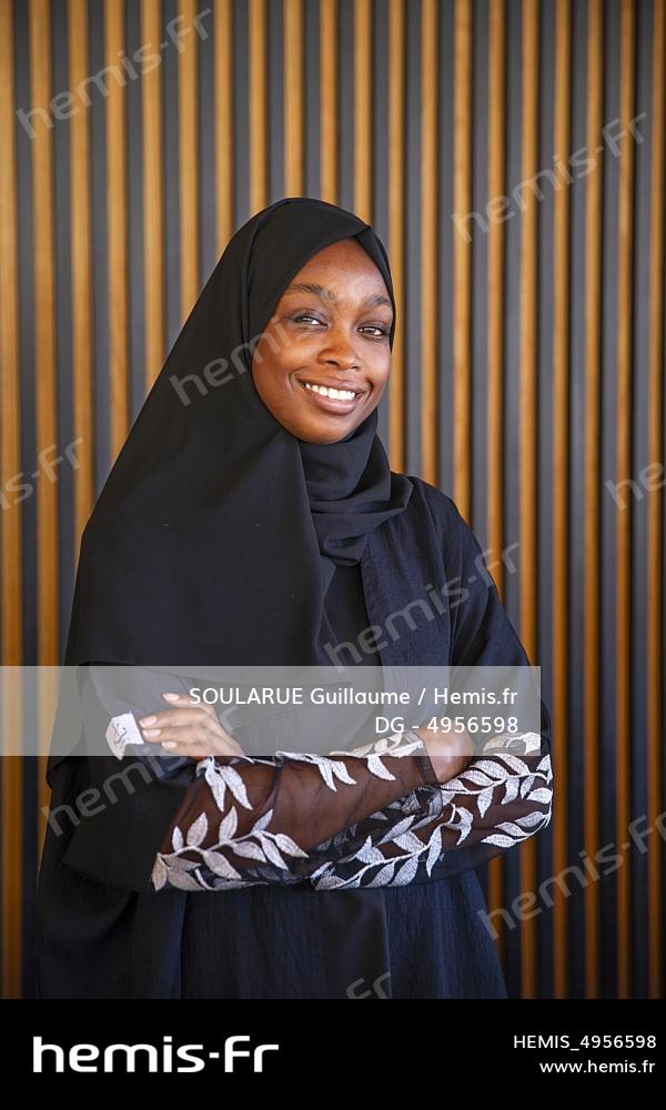 Arabie Saoudite, Al Ula, jeune femme saoudienne en abaya noir tavaillant à la réception du campement de luxe Our Habitas Al Ula posé dans un cirque falaises ocre