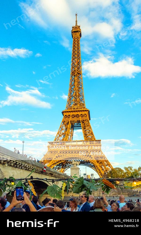France, Paris (75), apéro-soirée croisière sur la Seine, sur la péniche River-King, les soirs d'été, avec la Tour Eiffel