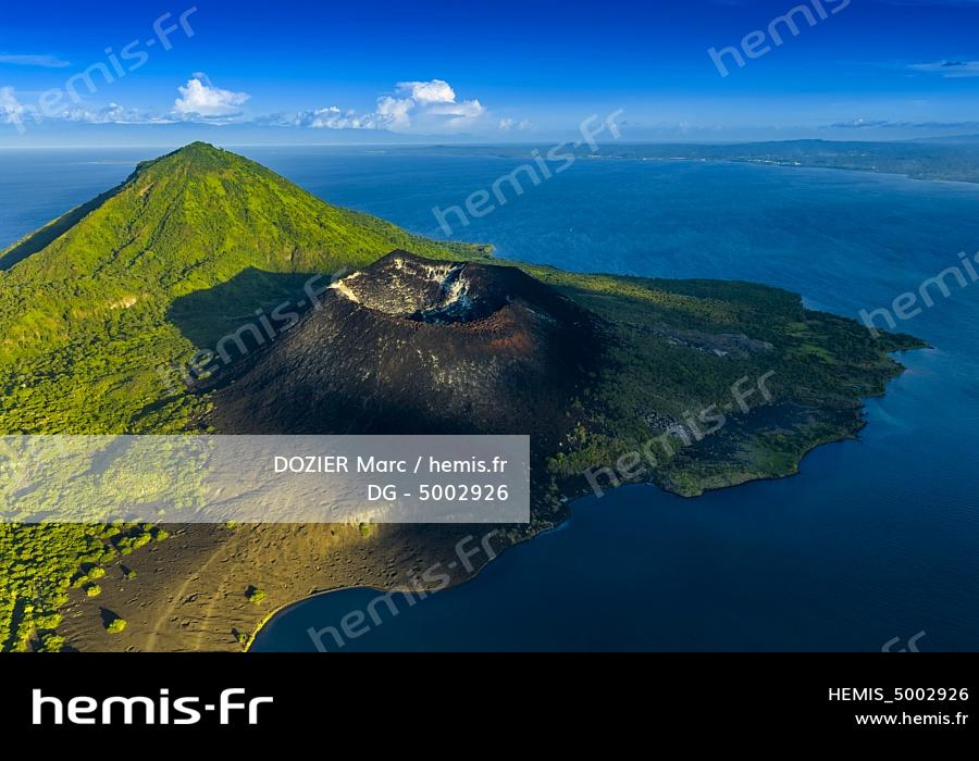 Papouasie-Nouvelle-Guinée, Province de Nouvelle-Bretagne orientale, archipel de Bismarck, île de Nouvelle-Bretagne, péninsule de Gazelle, district de Kokopo, baie de Rabaul, la ville de Rabaul, les volcans Tavurvur et Rabalanakaia (vue aérienne)