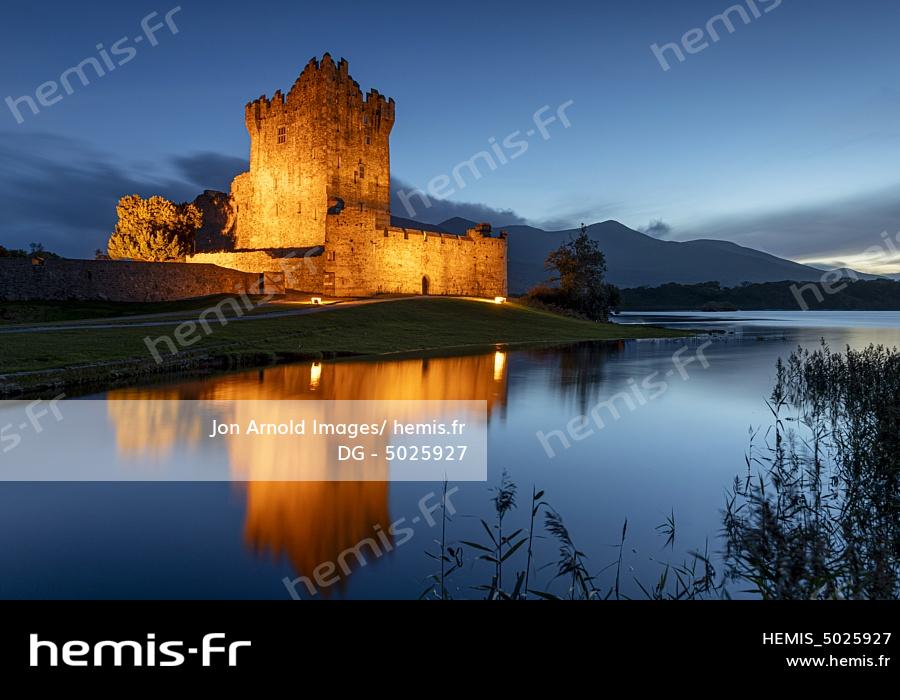 Le château de Ross la nuit, Lough Leane, Killarney, comté de Kerry, Irlande
