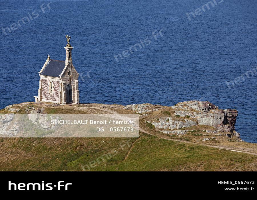 France, Côtes-d'Armor (22), Côte de Penthièvre, Erquy, îlot Saint-Michel, chapelle Saint-Michel (vue aérienne)