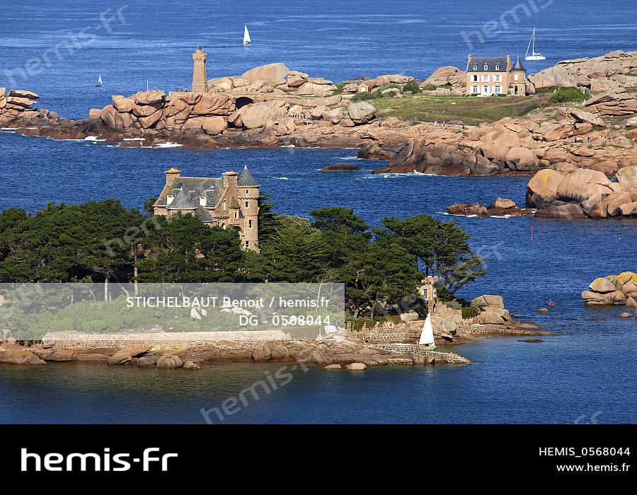 France, Cotes d'Armor, Cote de Granit Rose (Pink Granit Coast), Tregastel, Ile de Costaeres and castle, Pointe de Squeouel, Men Ruz Lighthouse (aerial view)