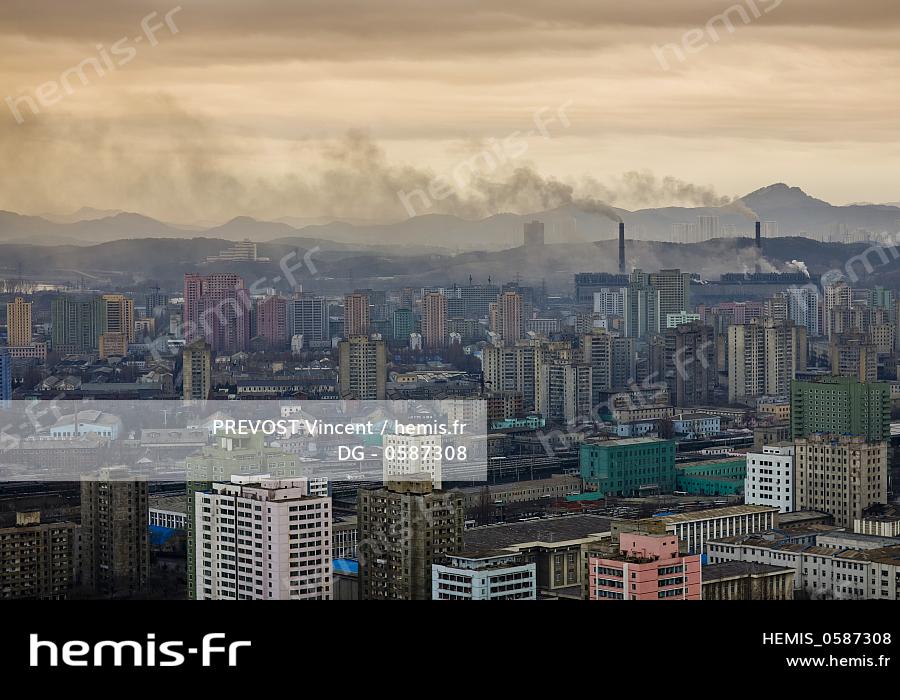 Corée du Nord, Pyongyang, Yanggakdo International Hotel, vue élevée sur le Fleuve Taedong et la ville