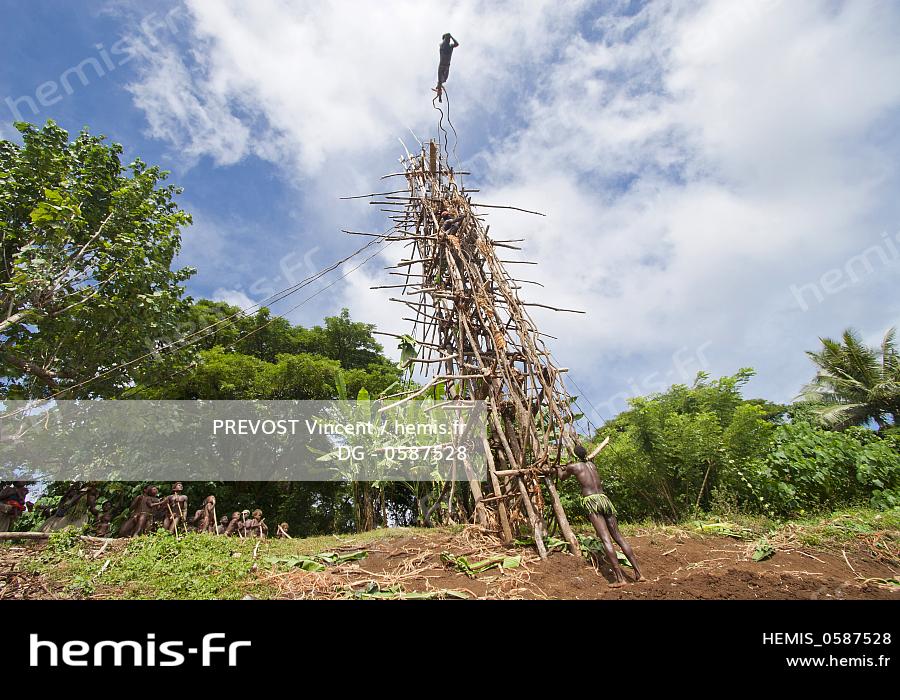 Vanuatu, Penama Province, Pentecost Island, Lonorore, Naghol, traditional land diving, rite of passage from childhood to adulthood, man jumping into space with creepers attached to the ankles