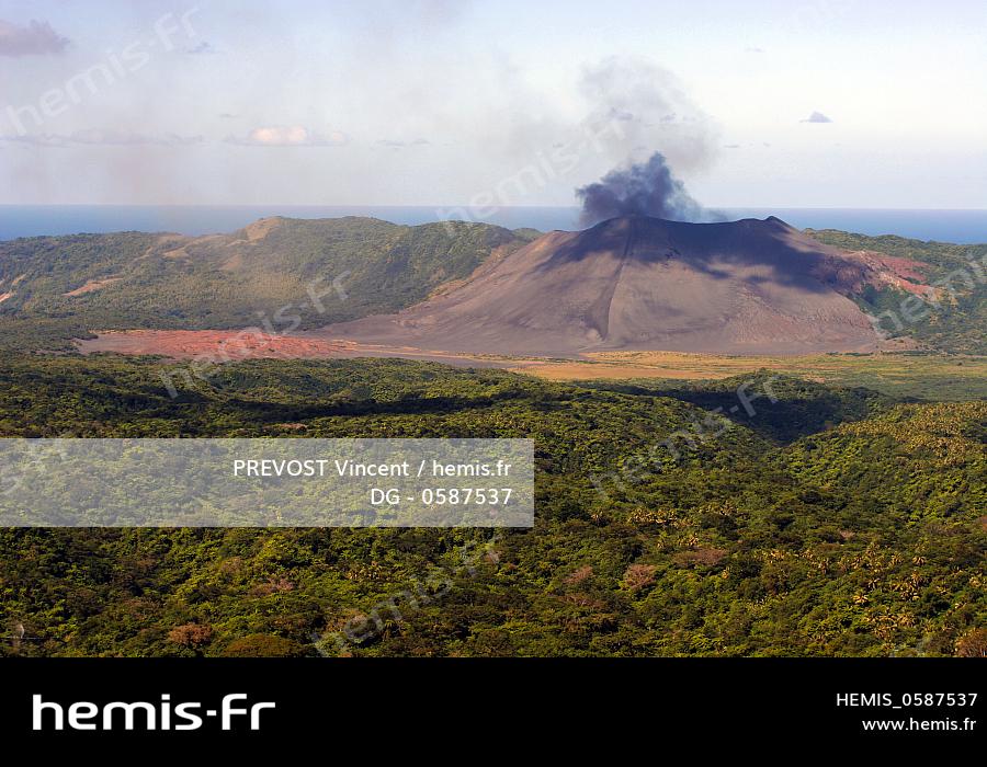 Vanuatu, province de Taféa, île de Tanna, Mont Yasur, éruption volcanique du Mont Yasur, vue d'ensemble avec des fumerolles et la jungle au premier plan
