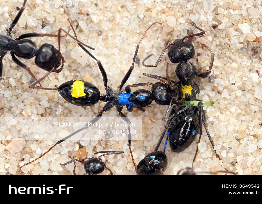 Espagne, Hymenoptera, Formicidae, Fourmi (Cataglyphis cursor), marquage couleur, tentative de libérer un congénère maintenu par un fil au niveau du pétiole