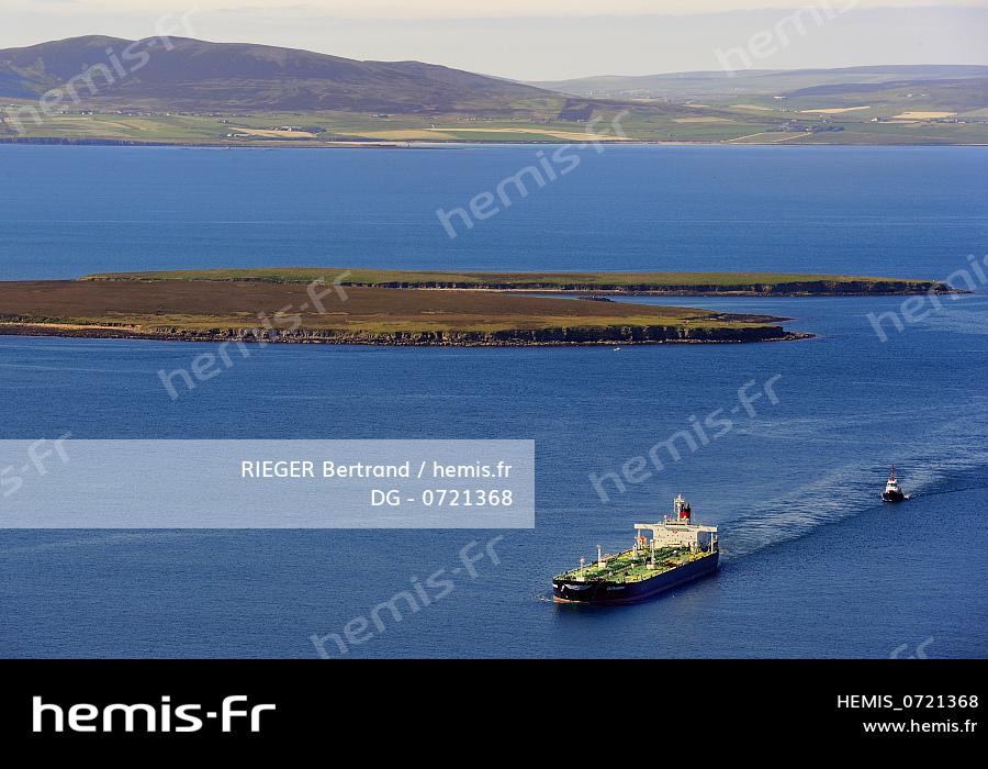 Royaume-Uni, Ecosse, Iles Orcades, tanker naviguant à Scapa Flow devant l'Ile de Flotta et l'Ile de Mainland en arrière plan (vue aérienne)