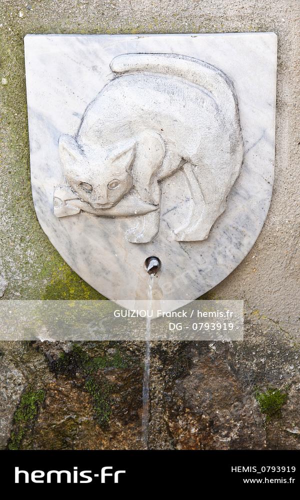 France, Pyrenees Orientales, Mosset, labelled Les Plus Beaux Villages de France (The Most Beautiful Villages of France), Medieval village, the fountain with the city blazon with a cat holding a rocket in his mouth