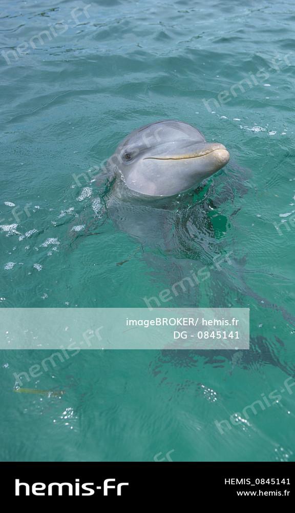Dauphin à nez de bouteille (Tursiops truncatus), tête et épaules hors de l'eau, Mer des Caraïbes, Honduras, Amérique centrale