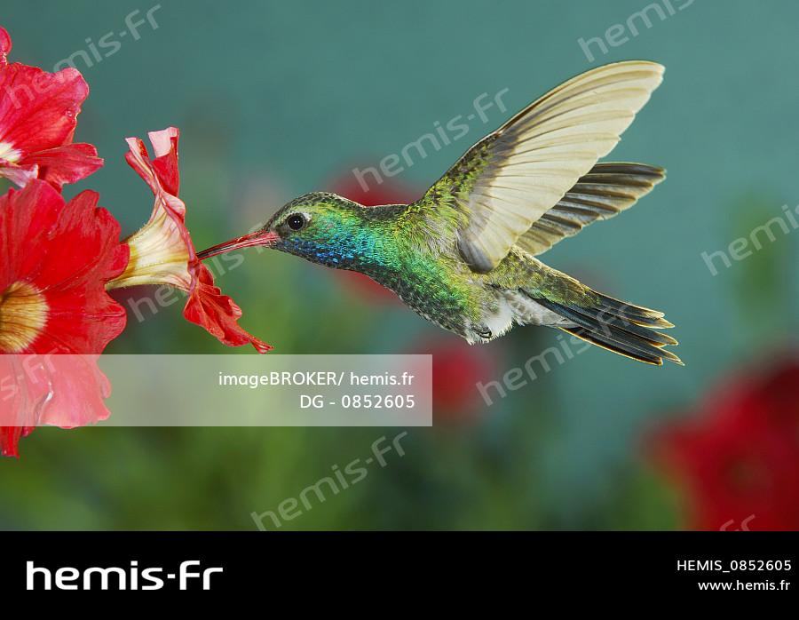 Colibri à bec large (Cynanthus latirostris), mâle se nourrissant de fleur de pétunia, canyon de Madera, Tucson, Arizona, USA