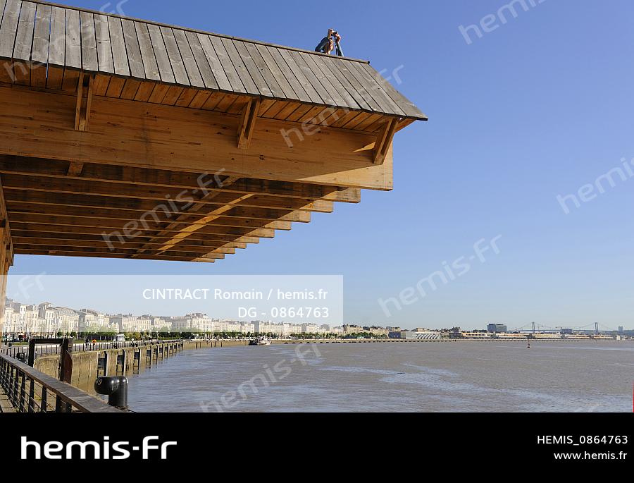 France, Gironde (33), Bordeaux, zone classée Patrimoine Mondial de l'UNESCO, le Port de la Lune, la passerelle en bois de l'architecte Japonais Kawamata relie la place des Quinconces aux quais de Garonne