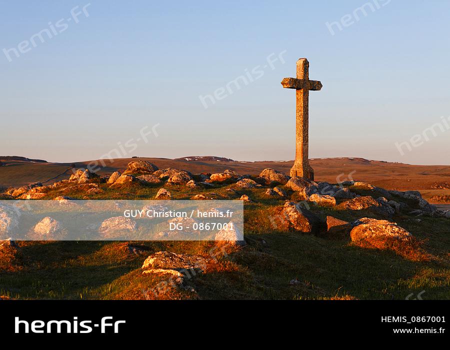 France, Lozere, Aubrac Plateau, cross at Lake St. Andeol on the Route of Compostela