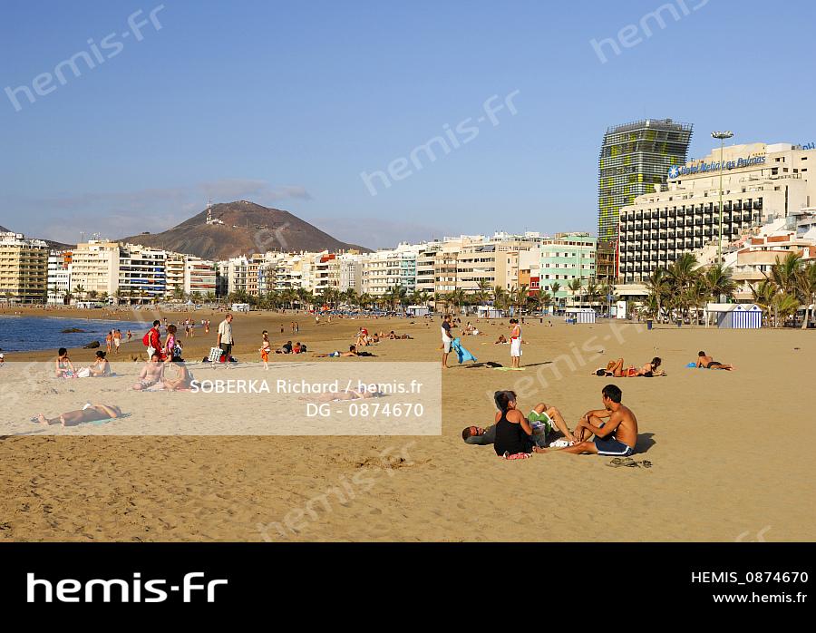 Spain, Canary Islands, Gran Canaria, Las Palmas de Gran Canaria, Las Canteras beach, vacationers on the beach