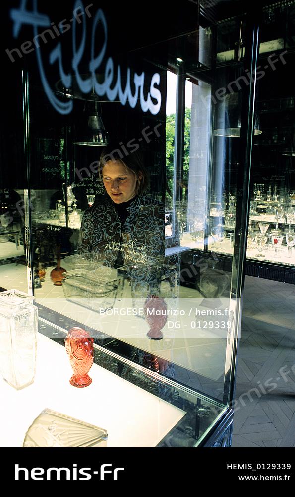 France, Paris, Museum of Baccarat shop on the Place des Etats Unis, room beyond transparency decorated by P. Starck